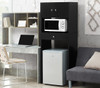 The design of this college storage unit has three separate areas to help store a variety of your essential college supplies. Over your college mini fridge is a sliding drawer that is the perfect spot for your college cooking utensils, plates, and other small dorm supplies. Above that, this black dorm storage unit has an open compartment for your dorm microwave so you don't have to eat cold food every day in your college dorm. Last, but certainly not least, this handy college mini fridge organizer has an upper cabinet with closing doors to hold more of your dorm cooking utensils and even some of your favorite snacks! Not only is this dorm organizer constructed to store your dorm supplies but it also helps your dorm room look clean and organized.